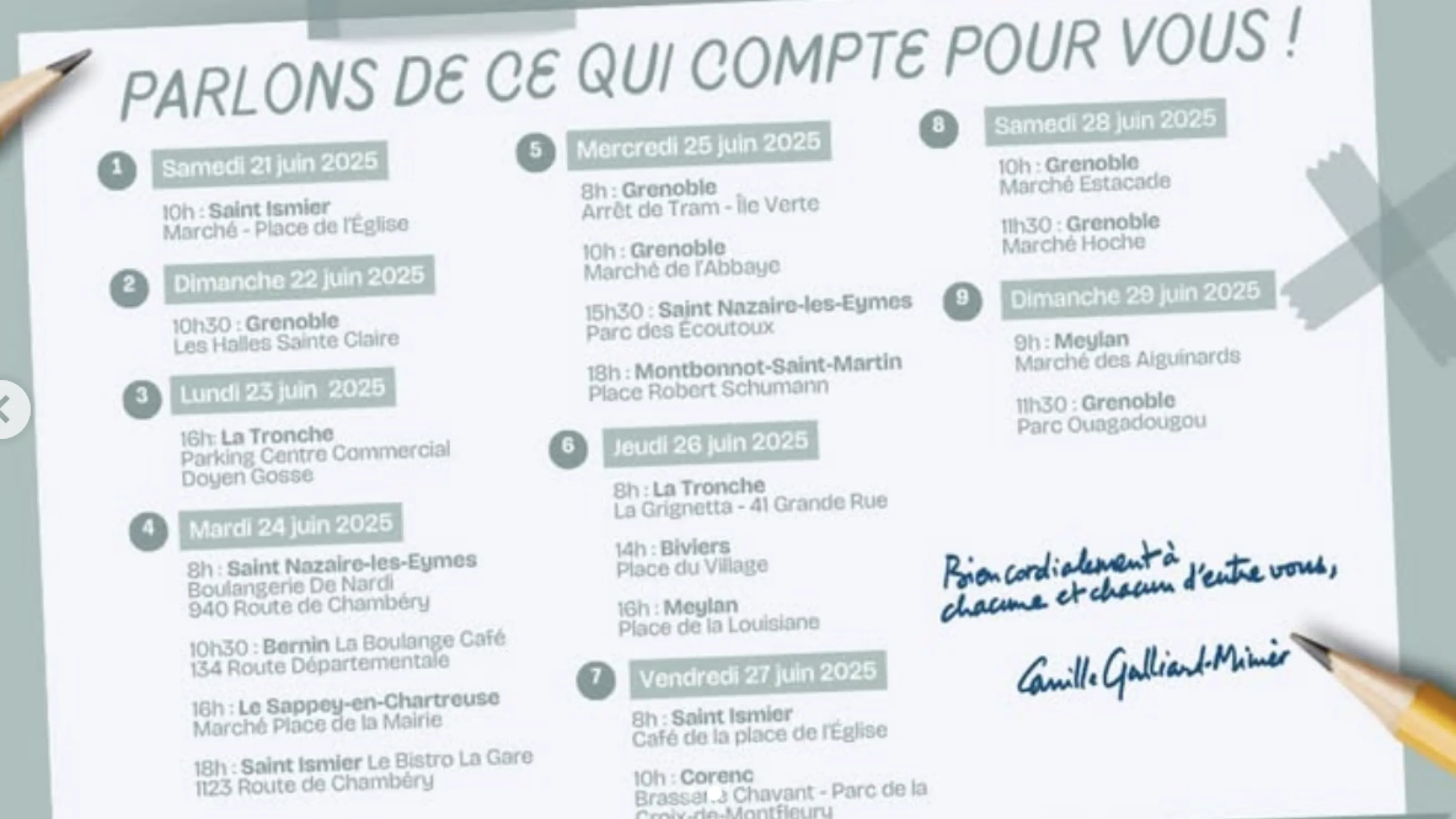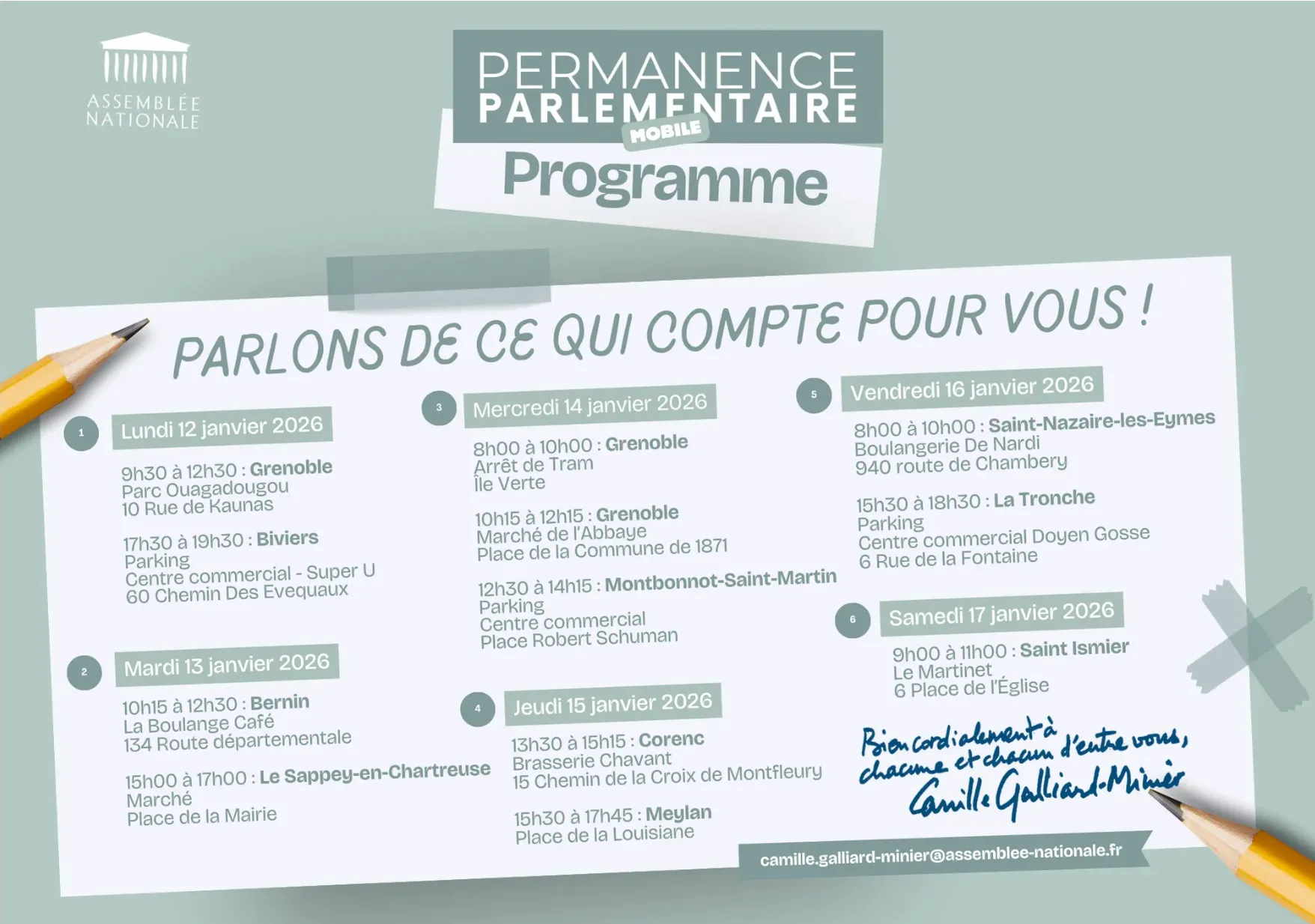 🎯 La Camillonette, c’est une autre façon de faire vivre le mandat : sur le terrain, dans le dialogue, au contact direct. Retrouvez le programme complet ci-dessous.